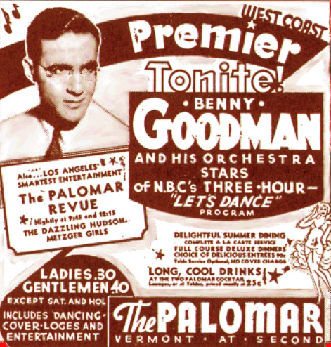 What Benny failed to consider was that the aforementioned “Let’s Dance” show had built up a nationwide audience for his band, and that fans were particularly concentrated on the West Coast. Hence, the fans were hungry for the good stuff when they were finally able to see the King-of-Swing-to-be in person. Hence, moreover, their consternation when Goodman and his band started off the evening playing the safe, sweet numbers that they thought would ensure their survival.