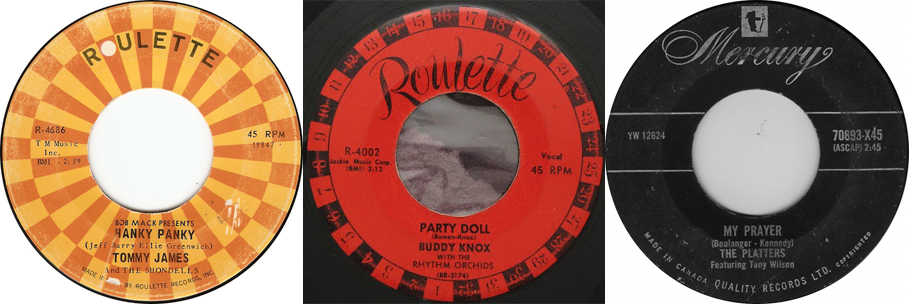 When one of the characters in the movie puts on a 45 RPM record, the song one hears is “My Prayer” by the Platters (right). Yet the record one clearly sees is a record with the Roulette label, from the mid-1960s at that (see left). In the mid-1950s, Roulette’s label had the design seen in the center. Translation: this was a double period goof.