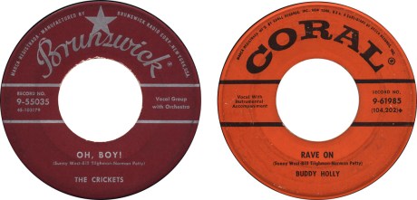 As an aside, there is often confusion on the part of many with regard to Buddy Holly vs. “The Crickets.” “What’s the difference?”, or some variation thereof, is the top FAQ. The historical evidence on hand does nothing to alleviate that confusion, as the group recorded on two different labels — both Decca subsidiaries at the time — and due to contractual quirks had to essentially split their name in two. Examples are shown below.
