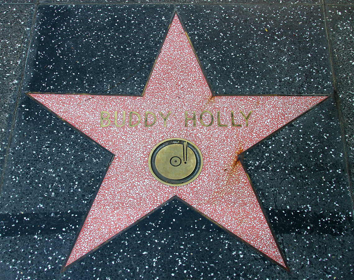 Buddy Holly’s star of fame on a sidewalk in Hollywood is, interestingly, right next to the famous Capitol Records studio building. Photo by author, Jan., 2015.