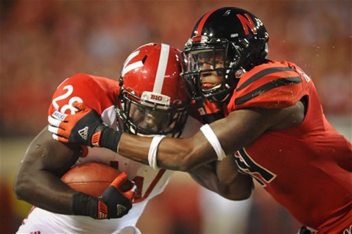 The Wisconsin-Nebraska game was not only a great game to watch from a purely game-play standpoint, with great execution on both sides of the ball. It was also a feast for the eyes from two teams who historically where rather stodgy uniforms. Both teams had sick-looking alternate, quasi-throwback unis (and we mean “sick” in the hip, with-it, good way!). The Badgers’ red helmets and red shoulders on white jerseys was a feast alone for the eyes, to say nothing of Huskers’ red jersey-pants combo with tasteful black trim, along with the first black helmets the team as ever donned – EVER. The proverbial icing on the cake was the large school letters worn on the front of both teams’ jerseys. All in all, a nice combination of throwback elements from the 1920s, 1940s, and 1950s! Speaking of which, did anybody notice the nice late ‘50s-style numbers on Wisconsin’s jerseys? One word: neato!
