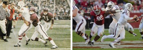 At right shows Alabama vs. Texas A&M in the 1968 Cotton Bowl. The Crimson Tide showed up in all-white to contrast the Aggies’ traditional maroon uniforms. In a nod to that game from over 44 years ago, this time it was the Aggies that showed in all-white yesterday (left) to contrast Bama’s traditional crimson unis. Look carefully, and notice how little the stripes on the teams’ pants have changed in four and a half decades!