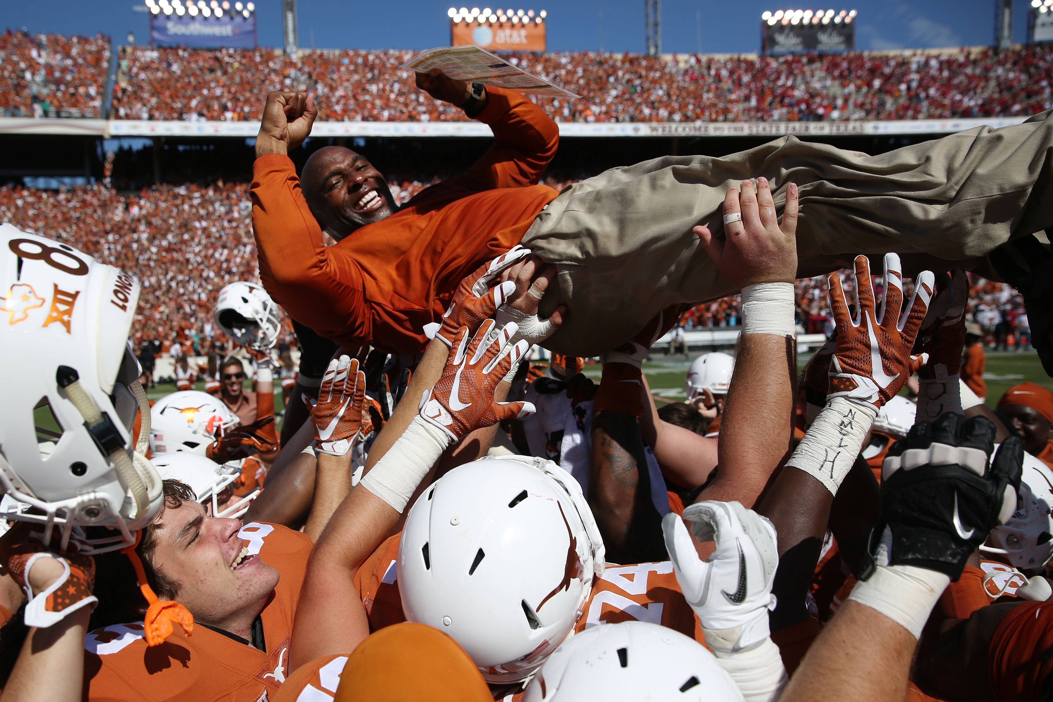 Texas head coach Charlie Strong celebrates with his team after their incredible upset over rival Oklahoma. Judging by the photo, it seems as though he might have won back the locker room. Photo from the Dallas Morning News.